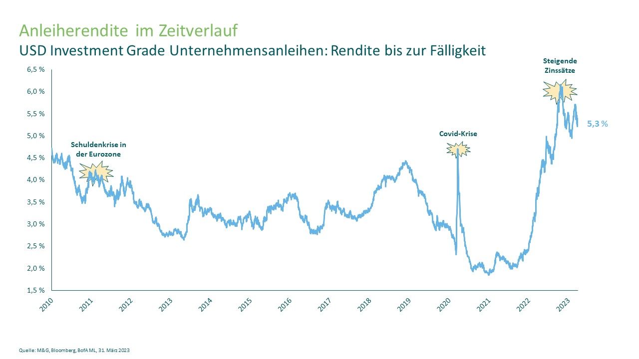 Nach einem Jahrzehnt mit Null- oder sogar Negativzinsen in den Industrieländern ist die Inflation sprunghaft angestiegen. Die Zentralbanken mussten ihren Kurs ändern und die Zinssätze aggressiv anheben. Darum stiegen die Renditen von Staats- und Unternehmensanleihen drastisch und die Anleihekurse fielen ähnlich rasant. Nach dieser Marktkorrektur ist die Ausgangslage für Anleiheinvestoren heute so günstig wie schon lange nicht mehr. Sie können jetzt eine Rendite von rund 5,3 % erzielen, wenn sie in US-Unternehmensanleihen mit Investment-Grade-Rating investieren; also in Titel mit hoher Qualität. Das kommt dem höchsten Stand seit über 10 Jahren nahe, und es ist mehr als auf dem Höhepunkt der Coronakrise. Volatilität verhindert dieses attraktive Renditeniveau nicht. Doch es bietet unserer Meinung nach eine gute Einstiegsmöglichkeit in die Anlageklasse.