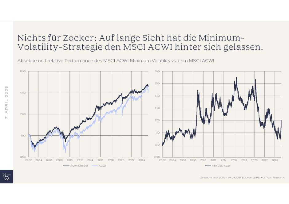 In einer Untersuchung hatte der Kapitalmarktanalyst von HQ Trust bereits 2023 die Entwicklung des Anlagestils Minimum Volatility mit anderen Faktorinvestments wie Value, Growth oder Nebenwerten verglichen. Sein Fazit: „Minimum Volatility hätte Ruhe ins Depot gebracht: In beide Richtungen fielen die Ausschläge geringer aus.“