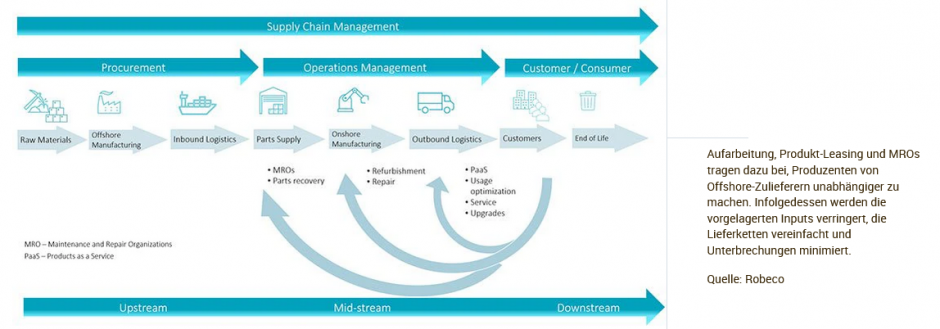 Im Zentrum jeder dieser Lösungen steht das Kreislaufprinzip, wonach Produkte länger in Gebrauch bleiben und sie so mehr Nutzen bei Kunden stiften und Erträge bei Unternehmen generieren können. Werden Produkte länger genutzt, hat dies außerdem den Vorteil, die Lieferketten in der Industrie unabhängiger von Rohstoffen und risikoärmer zu gestalten.