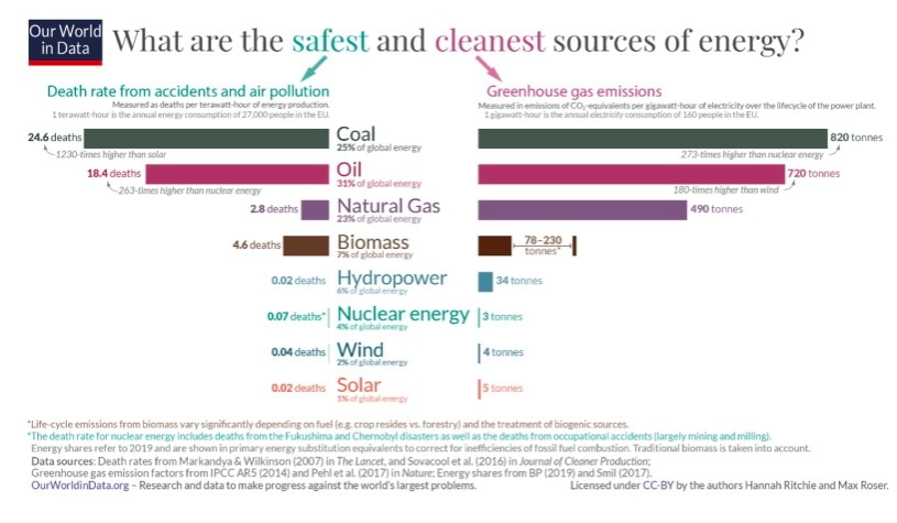 Trotz aufsehenerregender tragischer Ereignisse wie in Tschernobyl und Fukushima ist die Rate der Todesfälle bei Kernenergie unter allen Energiequellen eine der geringsten. Hinzu kommt, dass sie die niedrigsten Emissionen aufweist. Quelle: Our World in Data.