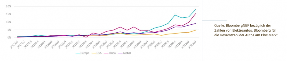 Die hier gezeigten TCO-Szenarien sind ein weiteres Beispiel dafür, wie reifer werdende Technologien die Kosten am Automobilmarkt nach unten drücken. Es wird auch deutlich, dass in europäischen Ländern ein Wendepunkt für die Verbreitung von Elektroautos erreicht wurde. Dies spiegelt sich in einer zunehmenden Dynamik bei den Autoverkäufen wieder. Im Jahr 2019 entfielen 3 % der Autoverkäufe in Europa auf Elektrofahrzeuge. 2021 erhöhte sich der Wert auf rund 17 % (siehe Grafik 2).