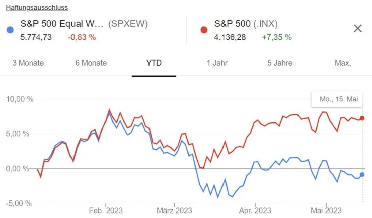 Hier lässt sich klar ablesen, dass die großen Titel den Index doch deutlich nach oben ziehen. Und tatsächlich haben die Indexschwergewichte wie Apple oder Microsoft in diesem Jahr schon um mehr als 20 Prozent zugelegt. Meta ist seit Jahresanfang sogar schon um 90 Prozent gestiegen. Die Tech-Werte sind also wieder da und zeigen ihre Stärke - verzerren so aber auch die Realität an den Börsen, denn die Masse der Indexmitglieder im S&P 500 hat nur wenig zugelegt oder sogar an Wert verloren.