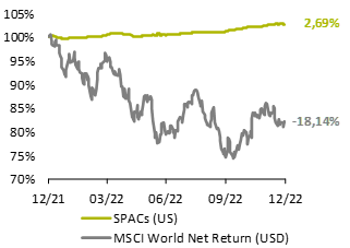 Mit einer Jahresperformance von 2,7% in USD sind SPACs eine der besten Long-Only-Anlagen im Jahr 2022 gewesen. Dabei war die Wertentwicklung nahezu linear.