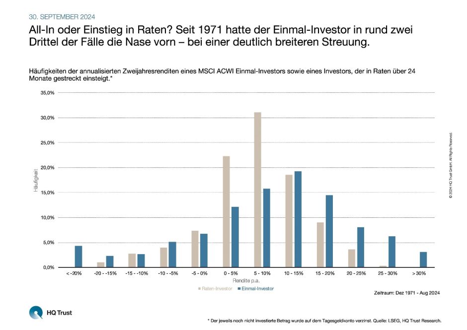 Der Kapitalmarktanalyst von HQ Trust stellt in seiner neuen Untersuchung die Anlageergebnisse von zwei Investoren gegenüber. Während der „Einmal-Investor“ die komplette Summe auf einmal anlegt, teilt der „Raten-Investor“ das Kapital in 24 gleiche Beträge auf und investiert es binnen zwei Jahren nach und nach. Die Rendite der Aktien misst Pascal Kielkopf mit dem globalen Aktienindex MSCI ACWI. Das „geparkte“ Kapital wird in seiner Berechnung mit dem jeweils aktuellen Satz für Geldmarktfonds verzinst.