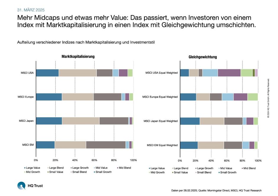Der Fondsselektor von HQ Trust vergleicht in seiner neuen Analyse die Zusammensetzung von vier wichtigen MSCI-Indizes in ihrer gleichgewichteten und der nach Marktkapitalisierung gewichteten Variante. Sie repräsentieren die vier großen Anlageregionen USA, Europa, Japan sowie die Schwellenländer. Dabei unterscheidet Jan Tachtler zwischen kleinen, mittelgroßen und großen Unternehmen (Small Caps, Mid Caps und Large Caps) sowie den Anlagestilen Value, Growth und Blend. Bei letzterem sind die zugrundeliegenden Aktien hinsichtlich des Stils relativ ausbalanciert. Für seine Analyse verwendet der Portfoliomanager die Daten aus der Morningstar Style Box per Ende Februar 2025.