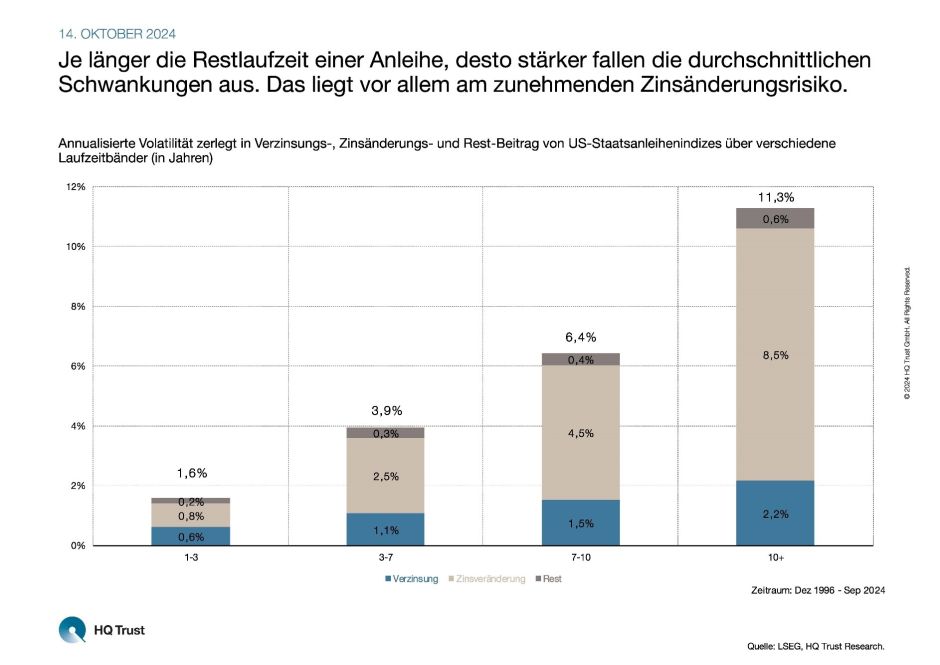 Der Kapitalmarktanalyst von HQ Trust vergleicht in seiner neuen Untersuchung die durchschnittliche jährliche Volatilität von verschiedenen US-Staatsanleihen-Indizes. Dabei teilt Pascal Kielkopf die Ergebnisse danach auf, wie viel der jeweiligen Volatilität aus welchem Effekt resultiert: aus der Verzinsung, dem Risiko einer Zinsänderung und einer Restgröße. Dahinter verbergen sich vor allem die sogenannten Roll-Down-Effekte, die mit der sich im Zeitablauf abnehmenden Restlaufzeit eines Bonds zu tun haben. Der Untersuchungszeitraum läuft von Ende 1996 bis September 2024.
