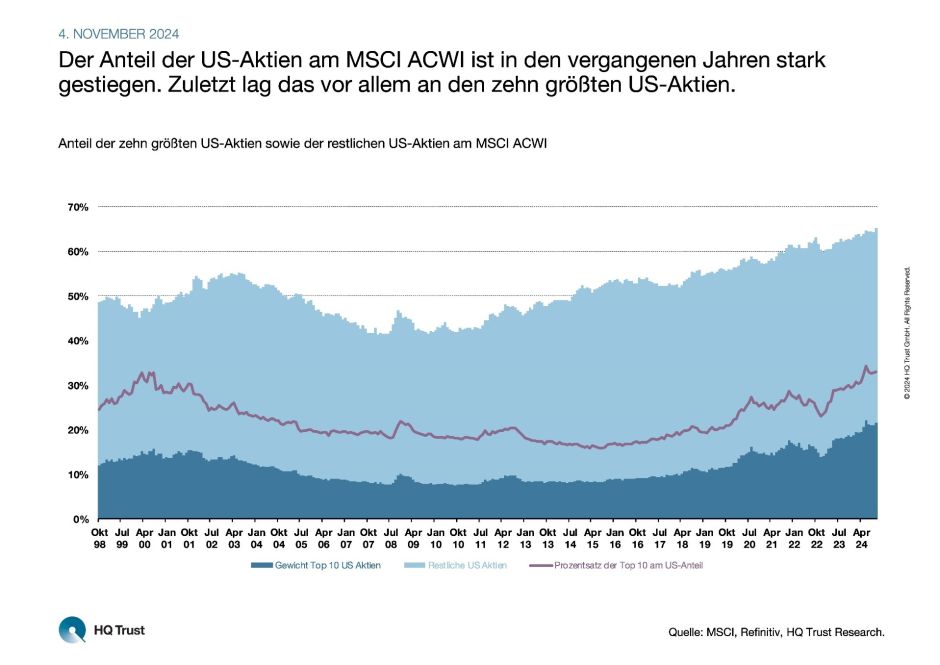 Für seine neue Untersuchung berechnete der Portfoliomanager von HQ Trust auf monatlicher Basis das Gewicht der US-Aktien am MSCI ACWI. Anschließend splittete er das Ergebnis auf: in die zehn größten Aktien – und den Rest. Jan Tachtlers Analyse umfasst den Zeitraum von Oktober 1998 bis Oktober 2024.
