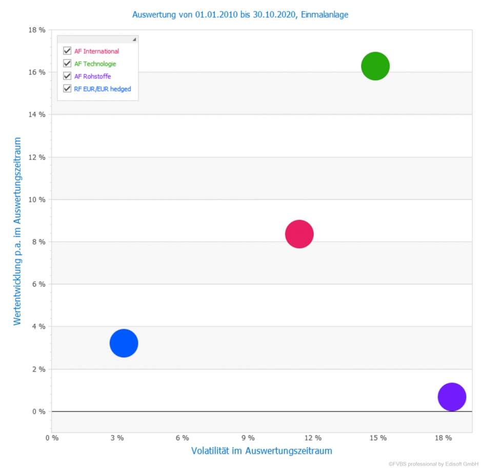| Einmalanlage: 01.01.2010 bis 30.10.2020 | AF International | RF EUR/EUR hedged | AF Technologie | AF Rohstoffe |
