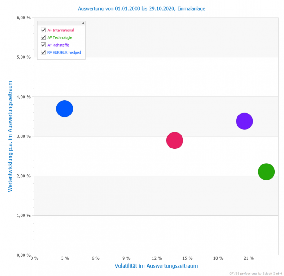 | Einmalanlage: 01.01.2000 bis 30.10.2020 | AF International | RF EUR/EUR hedged | AF Technologie | AF Rohstoffe |