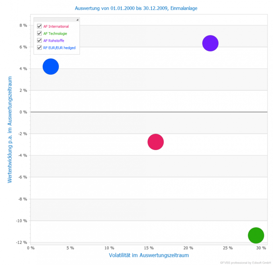 | Einmalanlage: 01.01.2000 bis 30.12.2009 | AF International | RF EUR/EUR hedged | AF Technologie | AF Rohstoffe |