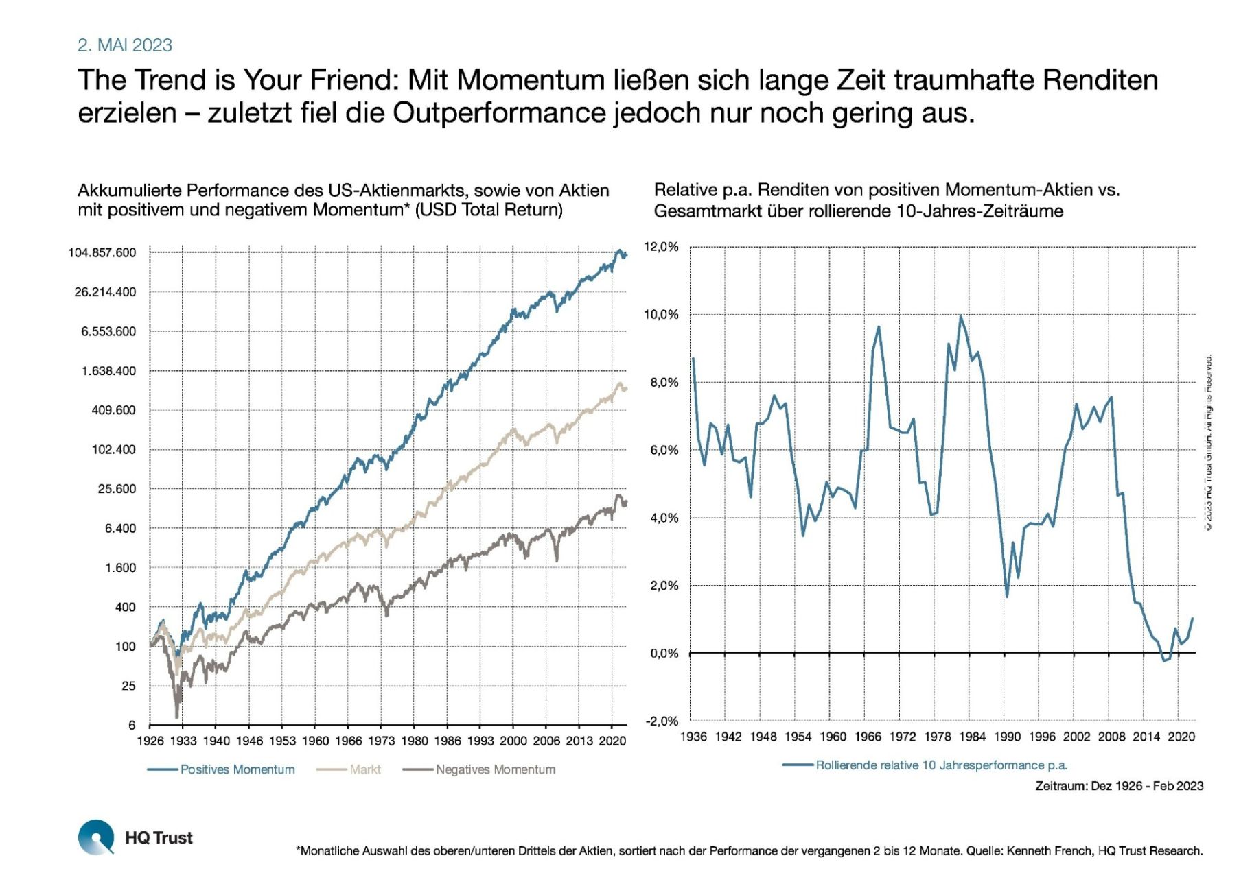 · „Wäre der Investor hingegen stets der Börsenweisheit „The Trend is Your Friend“ gefolgt und hätte das Drittel der Aktien mit dem höchsten Momentum gekauft, hätte die Rendite von 15,4 % p.a. den Gesamtwert des Portfolios auf rund 95,4 Millionen Dollar steigen lassen.“