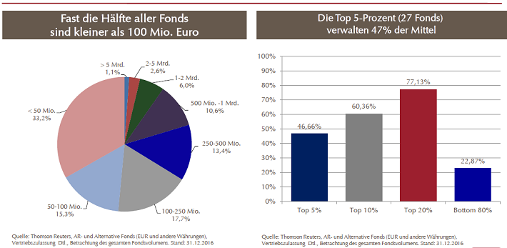 Doch die Großen unter ihnen dominieren die Branche. Die Top 5-Prozent, das sind gerade einmal 27 Fonds, verwalten fast die Hälfte der Mittel.