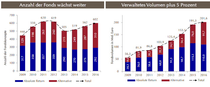 Doch nicht in allen Abteilungen der Fondsgesellschaften wird Trauerflor getragen: Für Absolute-Return-Fonds und Alternative Investments war 2106 ein Rekordjahr. Das Volumen an verwaltetem Vermögen stieg um 5,4 Prozent von 191,3 Milliarden auf 201,6 Milliarden Euro. 40 neue Fonds wurden am Markt erfolgreich platziert, ihre Zahl stieg auf jetzt 602 Fonds. Dies ergab die halbjährlich von Lupus alpha durchgeführte Absolute Return-Studie auf Basis der Daten des Fondsanalysehauses Thomson Reuters Lipper.