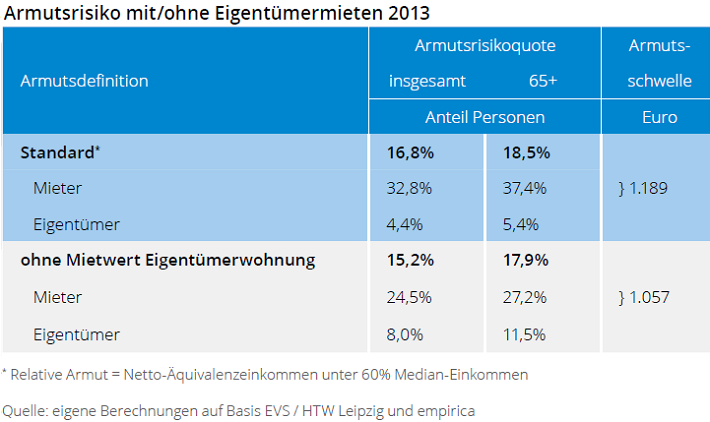Ein interessanter Aspekt war dabei, ob bei selbst genutzten Immobilien die ersparte Miete der Wohneigentümer als Einkommen zu verbuchen ist. Im Standardfall der Armutsforschung werden der Mietwert und dessen implizite Zahlung „an sich selbst“ als Einkommen verbucht. Ein Vorteil dieser impliziten Zahlung: Im Gegensatz zu einem Brutto-Renteneinkommen in gleicher Höhe bleibt die eingesparte Miete netto im Portemonnaie.