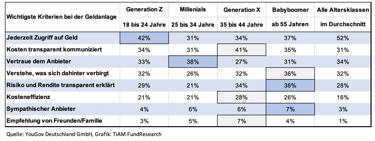 Laut Studie scheuen viele Menschen in Deutschland langfristige Bindungen, wenn es um ihre Ersparnisse geht: 42 Prozent der Bundesbürger möchten jederzeit auf ihr angelegtes Geld zugreifen können. Junge Erwachsene der Generation Z ab Jahrgang 1996 sind eher bereit, ihr Erspartes für längere Zeit in fremde Hände zu legen. 31 Prozent von ihnen möchten stets darauf zugreifen können. Weitaus mehr sind es unter den Älteren: In der Babyboomer-Generation möchte mehr als die Hälfte (52 Prozent) jederzeit über ihr Kapital verfügen können.