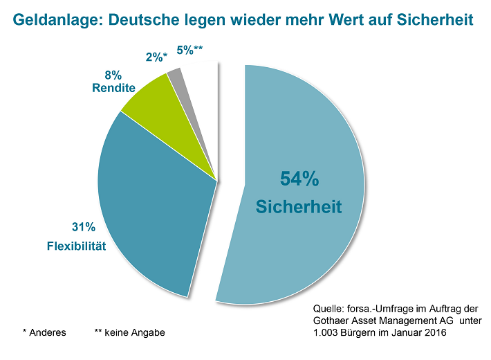 Während für die Deutschen bei der Geldanlage Anfang letzten Jahres ein Trend zu mehr Flexibilität zu erkennen war, steht aktuell das Thema Sicherheit wieder ganz klar an erster Stelle. Das ist ein Ergebnis einer repräsentativen Studie zum Anlageverhalten der Deutschen, die die Gothaer Asset Management AG (GoAM) von der forsa Politik- und Sozialforschung im Januar 2016 durchführen ließ.
