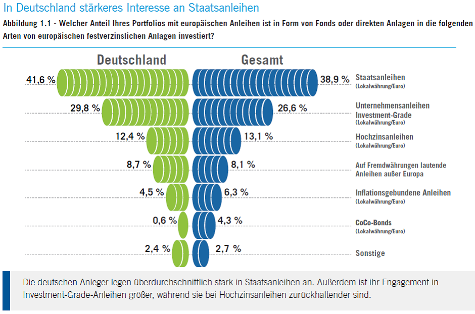 Die höhere Risikoaversion deutscher Anleger könnte durch die Hauptziele ihrer Festzins-Allokation erklärt werden: An erstes Ziel wird hier die Vermeidung des maximalen Verlusts genannt, gefolgt von der Erzielung sicherer Erträge für ihre Kunden. Die Vermeidung des maximalen Verlusts wird laut Studie von deutschen Anlegern mit 29% wesentlich häufiger als oberstes Ziel genannt als im Durchschnitt (13%).