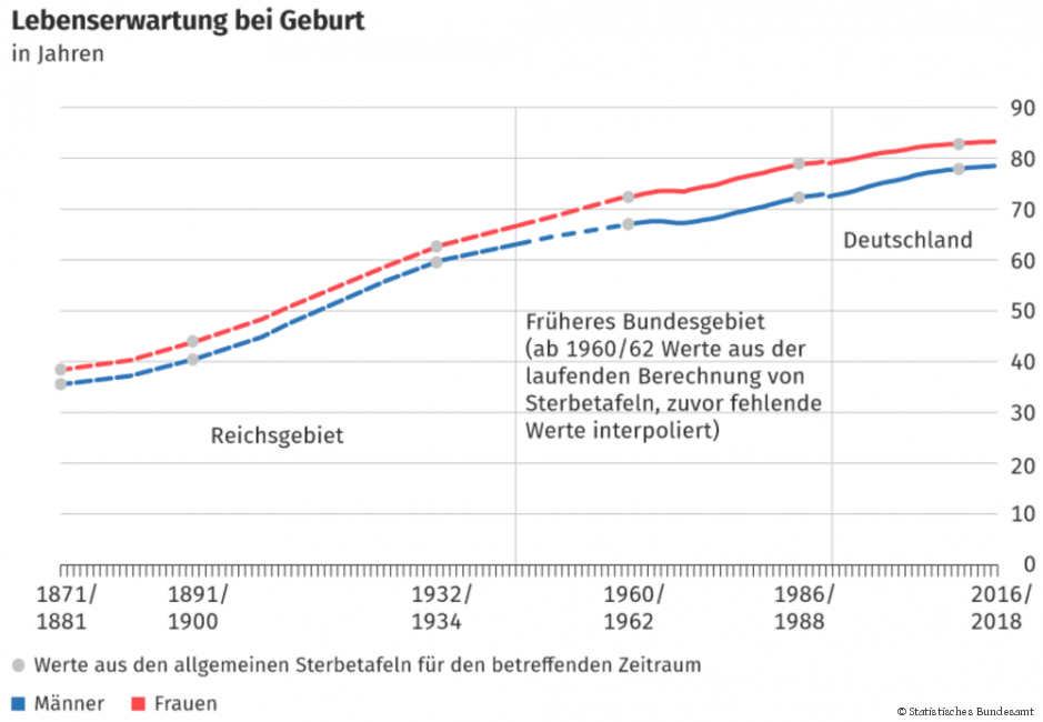 Tipp für Berater: Wie unrealistisch diese Erwartung ist, zeigt ein kurzer Blick in die aktuellen Zahlen des Statistischen Bundesamtes: Die durchschnittliche Lebenserwartung der Menschen in Deutschland ist in den vergangenen 100 Jahren stetig gestiegen – übrigens auch trotz der beiden Weltkriege. Deutsche Frauen erreichen mittlerweile im Durchschnitt ein Alter von über 83 Jahren. Männer werden im Durchschnitt rund 79 Jahre alt – Tendenz weiter steigend.