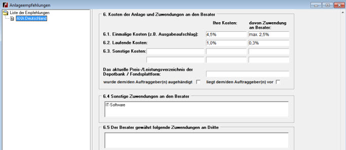 Das FINANZEN FundAnalyzer (FVBS)-Softwaremodul „Doku+“ von €uro Advisor Services GmbH macht Beratern das Leben dabei einfacher. Ein neu eingefügtes Formular bietet die Möglichkeit, neben den allgemeinen Beratungsdaten (Wertpapiere, Anlagebeträge, Informationsdokumente, etc.) auch die erhaltenen Zuwendungen einzutragen. Dies kann betragsmäßig oder unter Verwendung prozentualer Angaben, in jedem Fall aber Bafin-konform, geschehen (siehe Bild). Weitere Informationen zu „Doku+“ sowie die Möglichkeit eines kostenlosen Tests erhalten interessierte Berater unter www.fundanalyzer.de/doku.