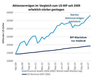 Ein Jahrzehnt der historisch niedrigen, bzw. negativen Realzinsen in Verbindung mit beispiellosen Anreizen in Form einer quantitativen Lockerung hat die neunjährige Konjunkturerholung angeheizt, die durch langsames Wachstum, fehlende Produktivität und eine dennoch stark steigende Aktienmärkte geprägt ist. In den vergangenen zehn Jahren hat eben dieser Aufschwung an den Börsen sowohl das nominale BIP-Wachstum als auch die Inflation in der Realwirtschaft deutlich übertroffen und damit ein hohes Risiko für Investoren geschaffen.