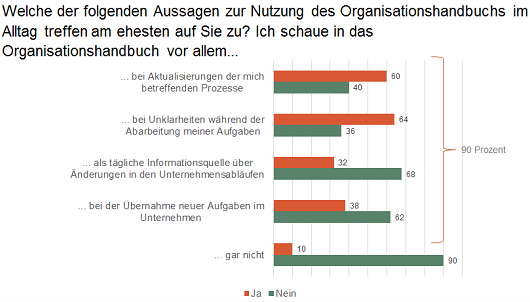 Eine mögliche Erklärung für das Fehlverhalten: Viele Mitarbeiter fühlen sich durch das gesetzlich vorgeschriebene Organisationshandbuch nicht ausreichend unterstützt und nutzen es deshalb nicht. Mehr als ein Drittel der Befragten bemängeln etwa einen bestenfalls mittelmäßigen Bedienkomfort. Fast ebenso viele schlagen sich mit teils unverständlichen Formulierungen herum.