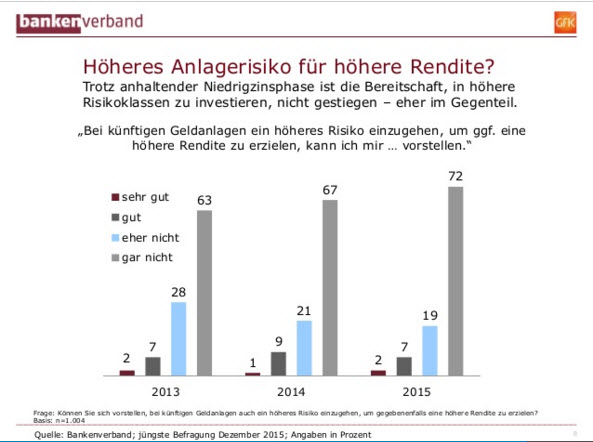 „Die deutschen Anleger sind trotz anhaltender Niedrigzinsphase und dementsprechend magerer Renditen nicht bereit, ein höheres Risiko einzugehen“, schlussfolgert Kemmer. „Eher im Gegenteil – der Anteil der Anleger, die jegliches Risiko bei der Geldanlage ablehnen, hat im Vergleich zum Vorjahr noch zugenommen.“ Sieben von zehn der Befragten könnten sich nicht vorstellen, bei künftigen Geldanlagen Risiko einzugehen. 2014 waren es noch sechs von zehn. Diese Einstellung könnte fatal sein, findet Kemmer. „Die heutigen Berufstätigen werden ergänzend zur Rente auf eine zusätzliche Altersvorsorge angewiesen sein, wenn sie später ihr Wohlstandsniveau halten wollen.“ Eine Rendite nahe Null reiche einfach nicht aus.