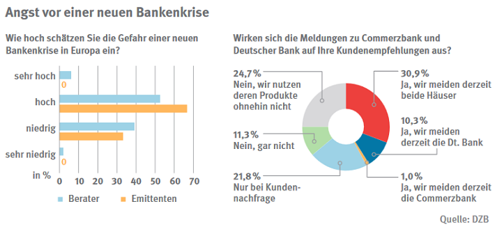Die Krise bei der Commerzbank und der Deutschen Bank wirkt sich auch auf den Vertrieb ihrer Finanzprodukte aus. Einige Bankberater sehen die Entwicklung der beiden deutschen Großbanken kritisch und empfehlen keine Zertifikate mehr, die von einem der beiden Banken als Emittent angeboten werden. Laut einer Umfrage des Magazins DER ZERTIFIKATEBERATER macht mittlerweile jeder dritte Berater bei Kundenempfehlungen einen Bogen um Zertifikate der beiden Emittenten.