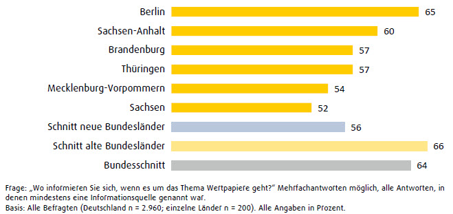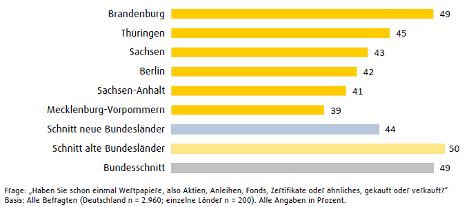 Neben den fehlenden Informationen ist auch die Erfahrung mit Wertpapieren im Osten geringer als im Westen: Während in den alten Bundesländern jeder Zweite schon einmal mit Aktien, Fonds, Anleihen oder anderen Wertpapieren gehandelt hat, sind es in den neuen Bundesländern 44 Prozent. Besonders in Mecklenburg-Vorpommern ist der Anteil mit 39 Prozent besonders gering. Brandenburg und Thüringen liegen mit 49 Prozent bzw. 45 Prozent in etwa auf West-Niveau.