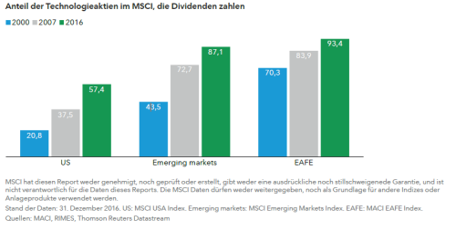 Technologieaktien hat man lange Zeit eher als Anlagen gesehen, die in das potentielle Wachstum eines Unternehmens investieren, und weniger als Anlagen, die Erträge generieren. Von diesem Gedanken sollte man sich verabschieden, denn immer mehr Technologieunternehmen schütten mittlerweile Dividenden aus. Der Anteil der Technologieaktien im MSCI USA Index, die Dividenden ausschütten, hat sich in den letzten 16 Jahren nahezu verdreifacht. Auch die Emerging Markets und Technologieaktien des MSCI EAFE zeigen einen ähnlichen Trend. Mehr dividendenzahlende Technologieunternehmen erweitern die Investmentmöglichkeiten für Investoren, die im jetzigen Niedrigzinsumfeld auf der Suche nach Erträgen sind.