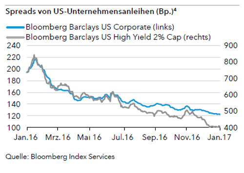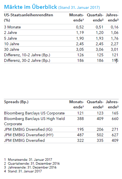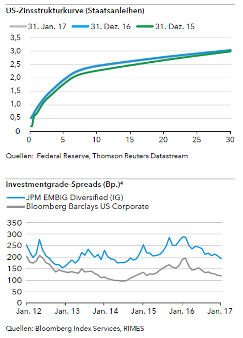 Nach der ausgeprägten Korrektur 2014/2015 waren die Rohstoffpreise im Februar 2016 auf ihren Tiefststand gefallen. Die anschliessende Erholung hielt auch nach den US-Wahlen an, da höhere Wachstumserwartungen die Nachfrage steigen liessen. Ausserdem hatten viele Förderer ihre Investitionen stark gekürzt, da zahlreiche Explorationsobjekte bei den niedrigeren Preisen unwirtschaftlich geworden waren. Der allmähliche Angebotsrückgang wurde Ende November durch die Entscheidung der OPEC verstärkt, weniger Öl zu fördern. Wenn sich das US-Wirtschaftswachstum dank Donald Trumps expansiver Fiskalpolitik wie erwartet beschleunigt, dürfte dies die Rohstoffpreise steigen lassen – zumal das Angebot abnimmt. Zu den Schwellenländern zählen sowohl Rohstoffimporteure wie die Türkei und Indien als auch Exporteure wie Brasilien und Russland. Insgesamt sind höhere Rohstoffpreise für Emerging-Market-Anleihen aber günstig.
