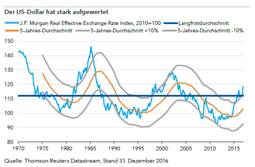 Es ist kein Zufall, dass die Rohstoffpreise ab Februar 2016 wieder stiegen, als die Dollaraufwertung gerade nachliess. Wenn der US-Dollar aufwertet, gehen die Preise dollardenominierter Rohstoffe meist zurück. Umso ungewöhnlicher war der Rohstoffpreisanstieg, als der US-Dollar nach den Wahlen an Wert gewann.Heute erscheint der US-Dollar nicht mehr günstig bewertet. Zwar könnte er weiter an Wert zulegen, doch dürften Tempo und Ausmass der Aufwertung kaum mit den Jahren 2014 und 2015 Schritt halten. Die Abbildung 1 zeigt, dass der Dollar in den letzten Jahren stark aufgewertet hat und im Vergangenheitsvergleich nicht mehr günstig ist. Eine langsamere Aufwertung oder gar eine Abwertung wäre für Emerging-Market-Titel sehr gut. Hinzu kommt, dass die meisten Marktteilnehmer zurzeit Dollar-Optimisten sind. Dies könnte ein Kontraindikator sein, sodass eine Abwertung möglich scheint. Nach unserem langfristigen Wechselkursmodell sind die Emerging-Market-Währungen insgesamt unterbewertet. Auch wenn wir vorsichtig bleiben, scheinen uns viele Währungen attraktiv.