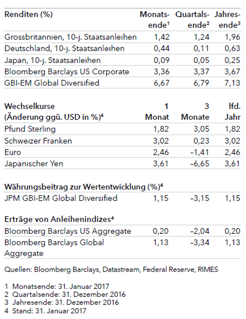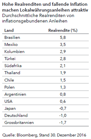 Der Anstieg der US-Staatsanleihenrenditen nach der Wahl von Donald Trump hat den Optimismus der Investoren für die Emerging Markets gebremst. Für den Vergleich von Anleihen in unterschiedlichen Währungen und aus unterschiedlichen Ländern sind aber die Realrenditen das bessere Mass, also die Differenzen aus Nominalrenditen und Inflation. Zwar sind sie nach den US-Wahlen gestiegen, doch lag dies zu einem grossen Teil an höheren Inflationserwartungen. Die Tabelle links zeigt, dass die Realrendite amerikanischer TIPS (Treasury Inflation-Protected Securities) Ende Dezember nur durchschnittlich 0,6% betrug. Noch schlimmer ist es in Japan, Grossbritannien und Deutschland, wo eine extrem expansive Geldpolitik in Verbindung mit steigenden Inflationserwartungen die Realrenditen noch immer deutlich unter null hält. In diesem Umfeld bieten Emerging-Market-Anleihen in lokaler Währung noch immer einen sehr hohen Realrenditeaufschlag gegenüber Industrieländertiteln. Hinzu kommt, dass die Inflation in vielen Schwellenländern anders als in den Industrieländern noch immer recht stabil ist und bisweilen sogar fällt. Die hohen Realrenditen in Verbindung mit stabiler Inflation sorgen also für attraktive Lokalwährungsrenditen – und das zu einer Zeit, in der die Realrenditen in vielen Industrieländern noch immer negativ sind.