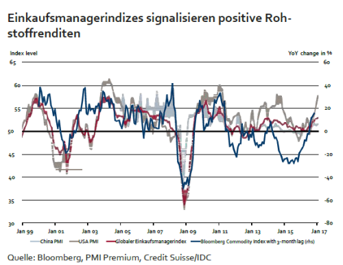Die globale Industrieaktivität expandiert weiterhin gleichmässig, und die Dynamik dürfte auch im 2. Quartal 2017 anhalten, wovon die Nachfrage nach physischen Rohstoffen profitieren sollte. Ein Vergleich zwischen den Einkaufsmanagerindizes (PMIs) für das verarbeitende Gewerbe und den Veränderungen der Rohstoffpreise am Kassamarkt spricht für positive Rohstoffrenditen im aktuellen Umfeld.