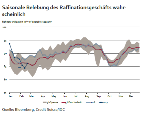 Zudem legen deutlich flachere Kurven an den Märkten für Rohölfutures – eine Folge des Ausgleichs an den physischen Märkten und von Absicherungsmassnahmen der Produzenten – nahe, dass die Erwartungen in Bezug auf die Spotpreise nicht allzu deutlich steigen müssten, um die Haltekosten zu übertreffen. Wir sehen für das 2. Quartal 2017 Aufwärtspotenzial in den Bereich von USD 60 pro Fass. Über dieser Marke würde sich das angebotssei- tige Wachstum in den USA wahrscheinlich zu stark beschleunigen.