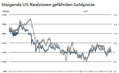Die Zinsmärkte beurteilten die Ankündigung der Fed, ihre Leit- sätze 2017 voraussichtlich dreimal zu erhöhen, während langer Zeit skeptisch. Doch die jüngsten Fed-Stellungnahmen deuten tatsächlich auf eine zunehmende Straffungsneigung hin. Damit steigt das Risiko einer Neubewertung an den Zinsmärkten, zumal die globale Wachstumsdynamik stark bleibt. Da die Inflationserwartungen in den USA in den vergangenen Monaten bereits beträchtlich zugenommen haben, könnten unmittelbare Leitzinserhöhungen die Realzinsen am kurzen Ende steigen lassen. Ein solches Szenario spräche gegen Gold, weil steigende Realzinsen wohl erneute Kapitalabflüsse aus dem gelben Metall auslösen würden.