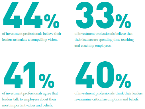 Die Studie wollte den Gründen für die schleichende Demotivation unter Investmentprofis nachgehen. Die Forscher stießen dabei auf einen wichtigen Faktor: das Agieren der Führungskräfte. Die Zahlen belegen eine offensichtliche Fehlentwicklung in der Branche: Nur zwei Fünftel der befragten professionellen Anleger in EMEA glauben, dass ihre Führungskräfte eine überzeugende Zukunftsvision formuliert haben. Nur ein Drittel stimmt zu, dass die Führungskräfte innerhalb der Investmentmanagement-Branchen in EMEA mit ihren Mitarbeitern über ihre wichtigsten Werte und Überzeugungen reden. Gerade einmal ein Drittel glaubt, dass ihre Führungskräfte Zeit investieren, um Mitarbeiter zu schulen und zu beraten.