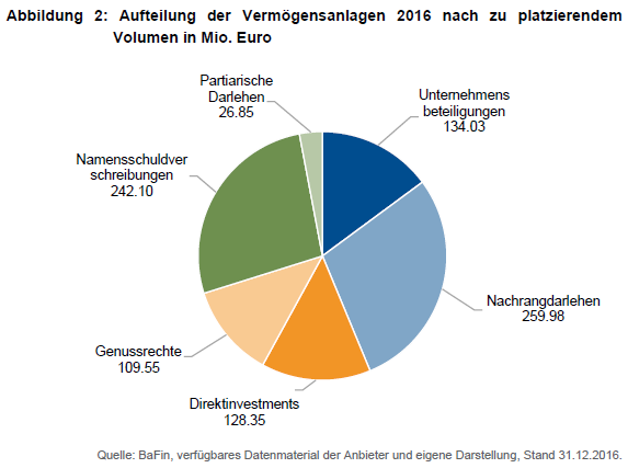Wie die Marktuntersuchung von Scope Analysis zeigt, entfallen in Bezug auf das emittierte Volumen im Jahr 2016 rund zwei Drittel auf Vermögensanlagen, bei denen Anleger eine Fremdkapitalgeber-Stellung einnehmen. Dazu gehören vor allem Nachrangdarlehen und Namensschuldverschreibungen.