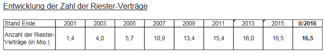 Nachdem der jährliche Zuwachs der Riester-Verträge bis zum Jahr 2011 überwiegend bei einer Million und mehr lag, ist für die Folgejahre eine deutlich geringere Dynamik festzustellen. In den vergangenen drei Jahren wurde kaum noch „geriestert“. Im Jahr 2015 sind im Vergleich zum Jahr 2014 lediglich rund 186 Tausend Verträge hinzugekommen. Die Gesamtzahl belief sich Ende Juni 2016 auf rund 16,5 Millionen Riester-Verträge. Als Ursache für die Stagnation nennt die Bundesregierung die aktuelle Niedrigzinsphase sowie die „oft sehr einseitige Berichterstattung über die Riester-Rente“. Zweifel an der Konstruktion des bürokratisch völlig überladenen und für Anleger wenig rentablen Produkts sind aus dem Bericht der Bundesregierung nicht herauszulesen.