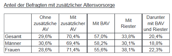 Insgesamt steigt die Verbreitung der zusätzlichen Altersvorsorge mit dem Einkommen an. Dies ist auf die betriebliche Altersversorgung zurückzuführen. Wird nur die private staatlich geförderte Altersvorsorge betrachtet, zeigt sich, dass Geringverdiener sogar etwas häufiger einen Riester-Vertrag besitzen als Besserverdiener.