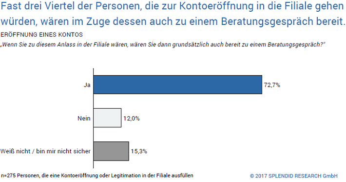 Die Gesellschaft für Qualitätsentwicklung in der Finanzberatung und das Marktforschungsinstitut SPLENDID RESEARCH haben im Rahmen einer repräsentativen Umfrage untersucht, wo und wie Bankkunden im Jahr 2017 erreicht werden können. Insgesamt zeigt sich, dass Filialbanken gerade bei der Kontoeröffnung erhebliches Potenzial zur Ansprache und Beratung der Kunden haben. Gleichzeitig sind Kunden aber auch so anspruchsvoll zu erwarten, dass ihnen ihre Bank online wie offline unkompliziert und kurzfristig zur Verfügung steht.