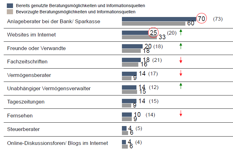 Die meistgenutzten Beratungsquellen sind der Studie zufolge Banken und Sparkassen. 70 Prozent der Befragten setzen auf diese persönliche Beratung. Auf Platz zwei der beliebtesten Beratungsquellen liegen die Websites im Internet. Nur 25 Prozent der Fondsbesitzer nutzen die Online-Beratung. Da aber 33 Prozent der Befragten angeben, Websites als Beratungsquelle bevorzugen, sehen die Autoren der Studie hier ein deutliches Potenzial. Traditionelle Quellen wie Tageszeitungen oder Fachzeitschriften verlieren hingegen an Bedeutung. Werden Fachzeitschriften noch von 18 Prozent der Fondbesitzer genutzt, sind es bei Tageszeitungen nur 14 Prozent. Vermögensberater und unabhängige Vermögensverwalter werden von 14 Prozent der Befragten aktiv genutzt. Bevorzugt werden die Vermögensberater jedoch nur von neun Prozent, die unabhängigen Verwalter von 15 Prozent. Abgeschlagen auf den letzten Plätzen liegen Steuerberater und Online-Diskussionsforen. Nur vier Prozent der Anleger nutzen diese Quellen.