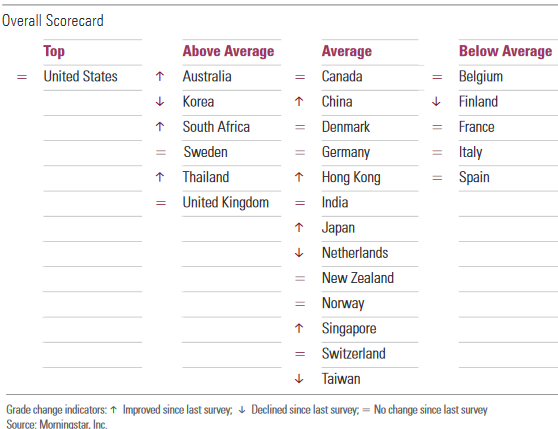 Im Allgemeinen bieten diejenigen Länder für Fondsanleger ein gutes Umfeld, die über eine unabhängige und proaktive Aufsichtsbehörde verfügen, wo sich die steuerliche Belastung in Grenzen hält und langfristiges Investieren fördert, wo eine hohe Transparenz herrscht, das Gebührenniveau moderat ist, Fonds über verschiedene Vertriebskanäle verfügbar sind und Anleger in den Medien umfangreiche Informationen über unterschiedliche Investmentmöglichkeiten vorfinden. Für jeden Teilbereich gibt es Punkte. Am Ende stehen Regionen-Rankings und ein globaler Vergleich. Unterm Strich steht in der Regel die US-Fondsbranche als anlegerfreundlicher Sieger auf dem Treppchen. Der Rest folgt mit Abstand. So auch in diesem Jahr.