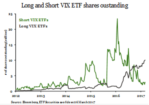• Der Bedarf an Finanzprodukten, die Schutz vor dem Anstieg der Marktvolatilität und damit des VIX versprechen, nimmt zu. Wir stellen fest, dass die Anzahl der ausstehenden Anteile von Long-VIX-ETFs auf breiter Front steigt, während die Anzahl der ausstehenden Anteile von Short-VIX-ETFs entsprechend gefallen ist.