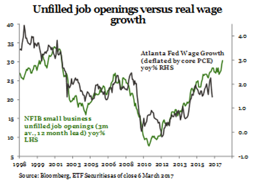 Die Gewinnmargen haben ihren Höhepunkt überschritten und lassen seit einigen Jahren tendenziell nach. Wir rechnen trotz des erneuten Wachstumsoptimismus in erster Linie mit einer Fortsetzung dieses Trends, da der Wettbewerb um die besten Arbeitskräfte zunimmt. Laut National Federation of Independent Business stieg die Anzahl offener Stellen erneut an. Die Arbeitgeber haben offenbar zunehmend Schwierigkeiten, geeignete Fachkräfte zu finden. Dies treibt die Löhne in die Höhe, die bereits jetzt rund 70 Prozent der Kosten eines Durchschnittsunternehmens ausmachen.