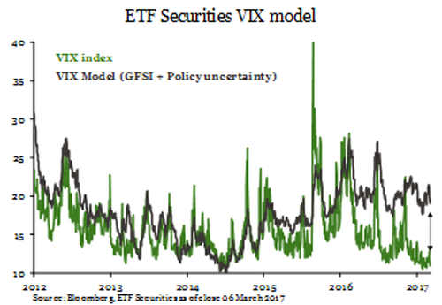 Um diese Frage zu klären, haben wir versucht, den VIX mit Hilfe anderer Messgrößen zu modellieren, und hierzu den Global Financial Stress Index (GFSI) und den US Economic Policy Uncertainty Index herangezogen. Der GFSI, der von der Bank of America Merrill Lynch entwickelt wurde, beruht auf einer breiten Palette von Risikokennzahlen, dem Absicherungsbedarf und der Risikobereitschaft der Anleger. Der zweite Index zählt die Nachrichten, die sich mit Wirtschaftspolitik, der Unsicherheit in der Wirtschaft und der diesbezüglichen Gesetzgebung befassen. Nach Justierung mit den Daten von 2001 bis 2014 bildet das Modell die Entwicklung des VIX mit einem R2 von 0,9 nach, das heißt, mit sehr hoher Genauigkeit. In letzter Zeit weiten sich allerdings die Abweichungen zwischen den errechneten Werten des Modells und den tatsächlichen Werten aus. Unseres Erachtens bedeutet dies, dass der VIX ungewöhnlich niedrig ist. Unserem Modell zufolge sollte der VIX mit 20 auf einem Niveau stehen, das üblicherweise mit einem höheren Marktrisiko in Verbindung gebracht wird.