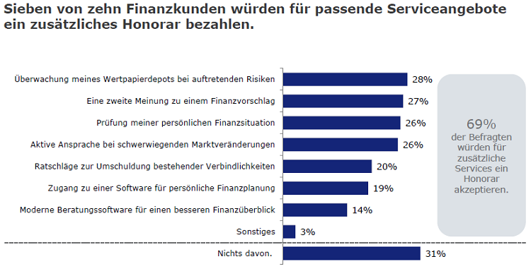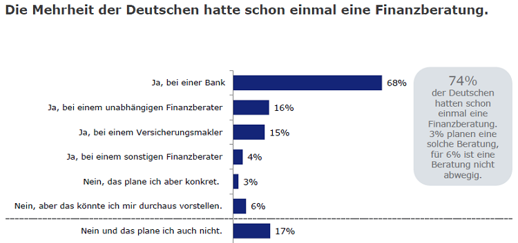 Einer der wichtigsten Erkenntnisse der Studie: Die Deutschen legen Wert darauf, individuell beraten zu werden. 97 Prozent der Verbraucher erwarten von einer Anlageberatung Empfehlungen, die auf sie persönlich zugeschnitten sind. Daher wollen 95 Prozent nicht, dass ihr Berater auf Produkte bestimmter Anbieter beschränkt ist.