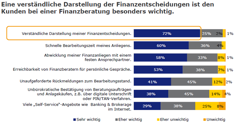 Anleger wollen verstehen und nachvollziehen können, warum und was ihnen im Rahmen einer Beratung empfohlen wird. Eine verständliche Darstellung der Finanzentscheidungen ist 72 Prozent der Kunden bei einer Finanzberatung besonders wichtig.