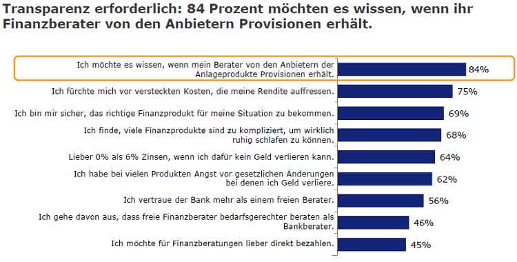 Beim Thema kosten sind die meisten Anleger zwar sehr sensibel. 84 Prozent der Befragten fordern Transparenz darüber, ob und von welchen Unternehmen ihr Berater Provisionen erhält. Doch den Kunden geht es dabei offensichtlich in erster Linie darum, Kosten zu sparen, sondern vor allem um das Thema Vertrauen. „Unabhängigkeit ist für Kunden ein wichtiger Maßstab für Beratungsqualität, für die viele auch bereit sind zu zahlen“, sagt Christian Hammer. Sechs von zehn Kunden würden laut Studie auch ein Honorar für eine unabhängige und kompetente Finanzberatung akzeptieren.