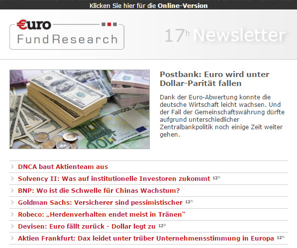 Der werktäglich erscheinende FundResearch-Newsletter hat ein Facelift erhalten. Neben der neuen Optik steht wie bisher die Aktualität und Selektion relevanter News im Mittelpunkt. Der Newsletter erscheint daher ab sofort zweimal täglich – mittags um 12 Uhr und wie gewohnt abends um 17 Uhr.