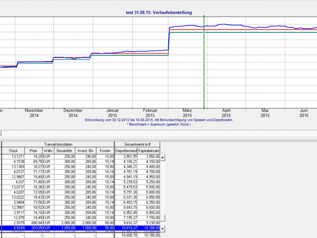 Für jeden Kunden bietet FVBS zudem die Möglichkeit, ein eigenes Kundendepot erstellen. Über „Kunde“ --> „Depot“ lässt sich eine Maske öffnen, in der sie eingerichtet und verwaltet werden können. Der Berater erhält eine detaillierte Einsicht in den Bestandswert, die Kosten, die Rendite und Allokation des Depots. Auch der Vergleich mit einer Benchmark ist möglich. Das Depot kann auch als Sparplan mit regelmäßiger Sparrate angelegt werden. Sollten einem Kunden mehrere Depots zugeordnet sein, besteht die Möglichkeit, ein konsolidiertes Kundendepot anzulegen. Dieses bietet dem Berater die Einsicht in den vollständigen Bestand seines Kunden aus dessen Depots. Sämtliche Wertentwicklungen der Depots lassen sich natürlich auch in Chartansicht darstellen.